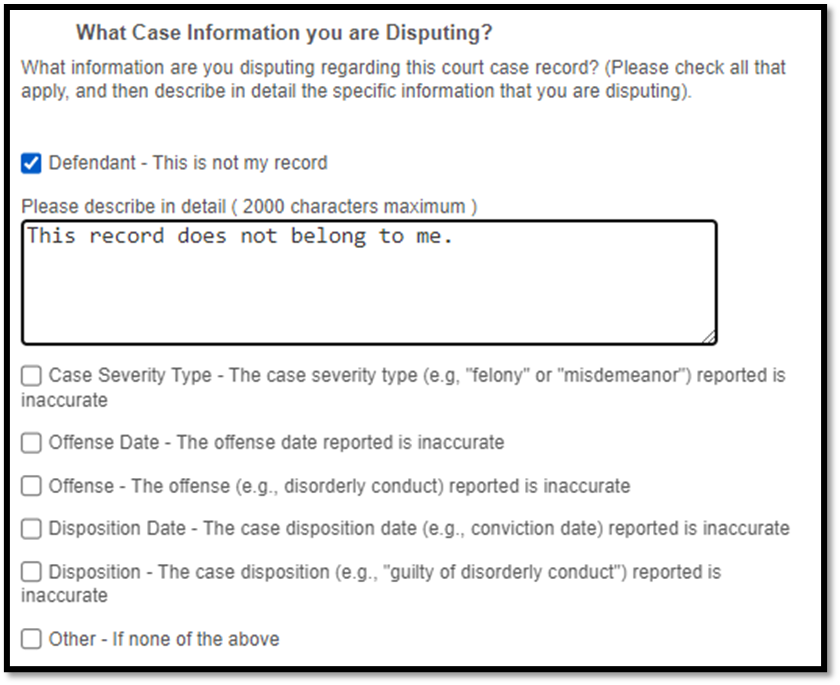 • Share the Case Number: Share the case number or describe the offense on your background check. Enter which state and county reported the record you're disputing.